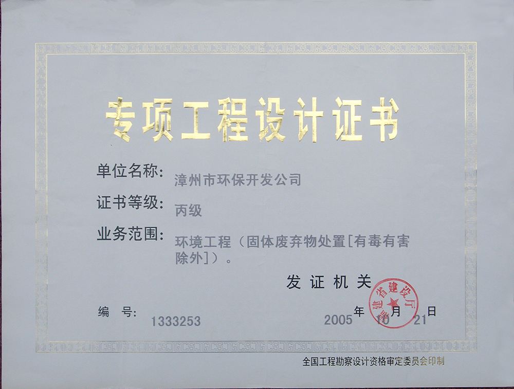 1、環境工程(廢水、廢氣)專項工程設計乙級,證書編號:3417;